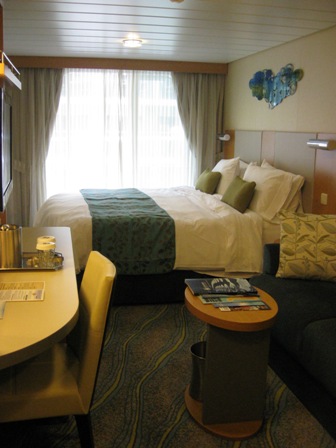 Once we were on the ship, we were off and running. We entered into the Royal Promenade area- which is a trademark of Royal Caribbean ships and the atmosphere is just electrifying. Several eateries along the Promenade including: Sorrento's the 24/7 pizza, the Cafe Promenade with quick service items (finger sandwiches, danishes, cookies, coffee, etc), Cupcake Cupboard (fee), Starbucks (fee), multiple watering holes and of course the new signature to this class of ship the “floating bar”. This bar moves amongst three decks- it’s pretty cool!
