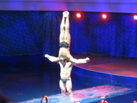 At the end of the Boardwalk is the Aqua Theatre- an innovative first at sea – this is what the name implies- a water theatre. We were able to see a preview of the types of shows they offer at the Aqua Theatre with high divers, acrobats, “Cirque” type of moves way above the air. It’s quite amazing what they are able to do for entertainment on board a ship these days. They also previewed a light/water fountain show that was absolutely incredible. Something to note, from some of the Boardwalk View balcony cabins, you may have a partial view of the Aqua Theater and be able to see that from you own balcony. There are at the aft ends of the ship, the Aqua Suites, which all come with huge balconies that do afford a full view of the Aqua Theatre. There is also a big screen TV and two smaller, but still big screens on each side for other viewing when shows are not in progress. They had the NFL games on the screen during the time we were visiting.