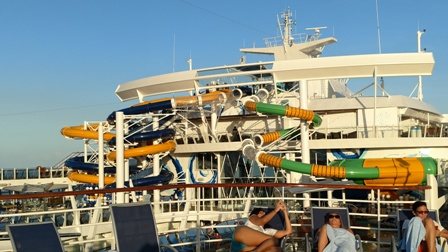 The Sports Deck neighborhood has it all!   Flow Rider machines for boogie boarding and surf simulating.  Zip Line that runs across the Boardwalk area.  Two Rock Climbing Walls.  Basketball/multi-sports court,  ping pong tables, miniature golf...seriously, you cannot get bored with so much offered!    The new addition on this ship is The ABYSS.  WOW!!!  This is a slide (no water) that takes you from Deck 16.5 all the way down to the Boardwalk on deck 6 in about 11 seconds roughly.  SO. MUCH.FUN!!   You sit in a sliding assisting device and hold on tight as you zip down this slide.    Of course, plenty of pools and a water zone for kids with their own miniature water slide, hot tubs by the main pools and two additional hot tubs that are cantilevered.  And the new addition to the pool areas for this ship...real water slides...3 of them and they are pretty darn fun- I tried all of those as well!  It’s hard to believe that RCCL has never had water slides on any of their ships before, but they realized that this was something needed.