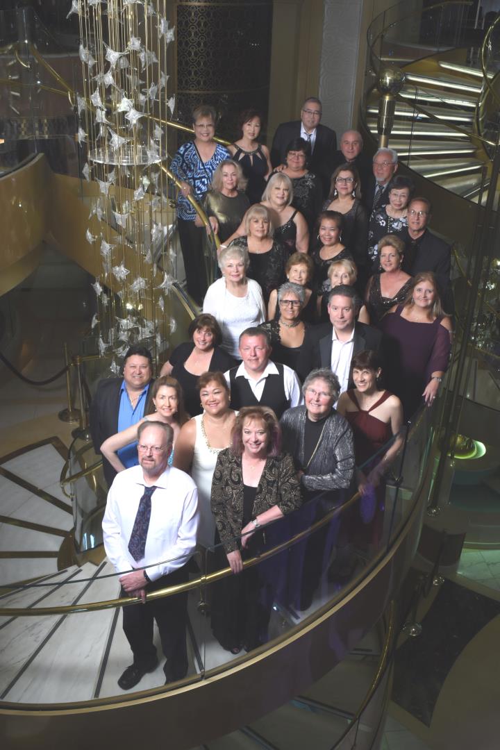 dinner with the entire group and that went very well. They had a secluded section of Crooner's Piano Bar set up for us and the cocktail waiters/waitresses were wonderful. It was also pretty fun to see all of us dressed up!! Everyone cleaned up very nicely & before we let the early birds go for dinner, we were able to take a lovely group photo on the staircase.