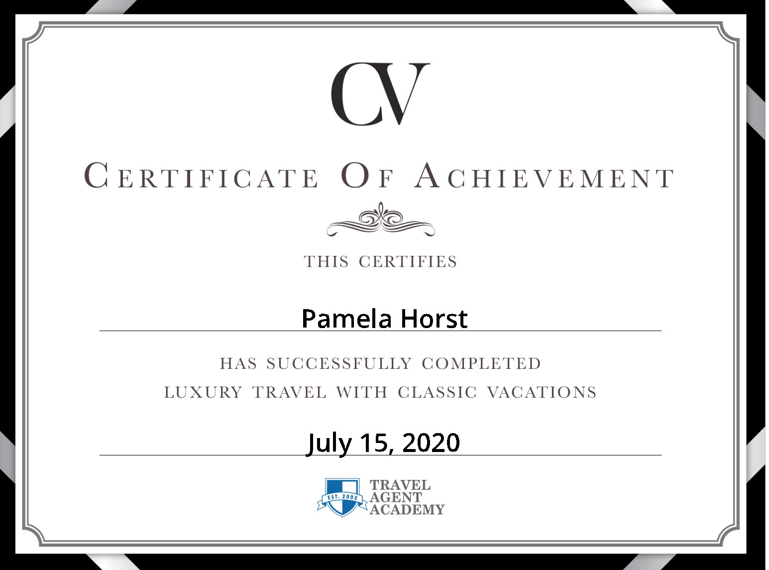 In addition to my 30+ years of active travel specialist experience, I continually take educational courses to add to the wealth of knowledge that I already possess. I love to learn and this is an ever-changing industry ~ there is always something new to learn!