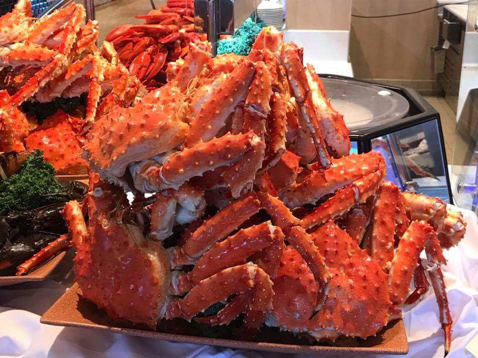 Norwegian is known for having multiple dining venues, go where you want, when you want, dine with who you want at whatever time you want, etc. They really did a nice job with this ship, it's easy to walk through and easy to navigate. It just makes sense. For the inaugural event, our 2 dinners were set in the Manhattan Room (main dining room) and we enjoyed our meals both nights. We had lunch at Margaritaville one day (huge Nachos that were delicious) & we ate poolside another day at the grill & on embarkation day they had a full, amazing & impressive buffet waiting to showcase all the sorts of food to be offered...check out these crab legs!!