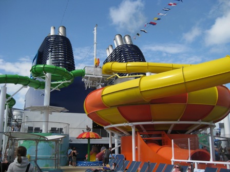 Of course there is a nice main pool area for families, singles, couples- everyone and the Caribbean band will normally play the afternoons poolside. There are three pretty amazing water slides and I regret not having taken the time to try them out. The first day at sea was a bit windy and I didn’t want to get wet and then be in the wind and then I got sick the next day with a cold and just didn’t think it was a wise idea to get wet. There is also the Adult area- Spice H2O with a big screen TV and music playing throughout the day. The pool is small, simply made for dipping. On a sea day that is sunny, it can be hard to find a lounge chair in this area of the ship. There are plenty of other decks though all about the ship with deck chairs.