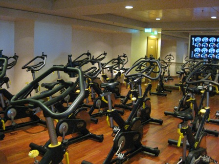 I was extremely impressed with the fitness facility- beautiful wood flooring throughout and a dedicated spin room with computerized tracking devices so you can see what everyone is doing in class. A dedicated group exercise room and also a dedicated seminar room. There is another training area for group classes using the TRX training system and Kettle Ball boot camp. I would have liked to try some of their classes because in talking to the instructors on the first day, once I found that she had a Les Mills background with certifications, I knew she would be a quality instructor. The times of the classes just didn’t work into my schedule, although they did not restrict their classes to early morning only. On sea days they did have some mid-afternoon classes but we usually sleep in until noon on sea days and get up have lunch and lounge pool side. A couple of evening classes, but we already had conflicting dinner reservations.