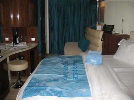 Staterooms are different. They designed these to have a curve in the wall so that there is more of a circular feeling to them vs. a block; and the bathroom is not really a room. You have a stand alone shower and a toilet cubby area on each side of the front door as you walk in and then as you get just past those you have your sink with medicine cabinet, which is just one step away from the bed. There is not a lot of wiggle room around the bed and with two of us in the cabin we did find we had to get out of each other’s way often when getting ready for the day or evening. The closet is all the way in near the balcony and although I did like the layout of the closet and the great amount of space, Most people would want their clothes close to the shower/bathroom area. I know that my cabin could accommodate a third person on the couch, but I would never recommend it, there just is not enough room for three people. The balcony was a good size- we once again had an aft-facing balcony and this time it fell in between the size of our gigantic balcony on Celebrity Infinity and our smaller, disappointing balcony on the MSC Poesia. I know it’s a gamble with those locations, but I still love that view! I do think that NCL will find that the bathroom idea is going to cost them in the long run, the ship is not quite a year old yet and the entry way of our cabin floor was bubbled- from water dripping when one gets out of the shower- it can’t be helped. I did not get a chance to view the Villas, but did get a picture of their Private Courtyard by taking one from the fence above.