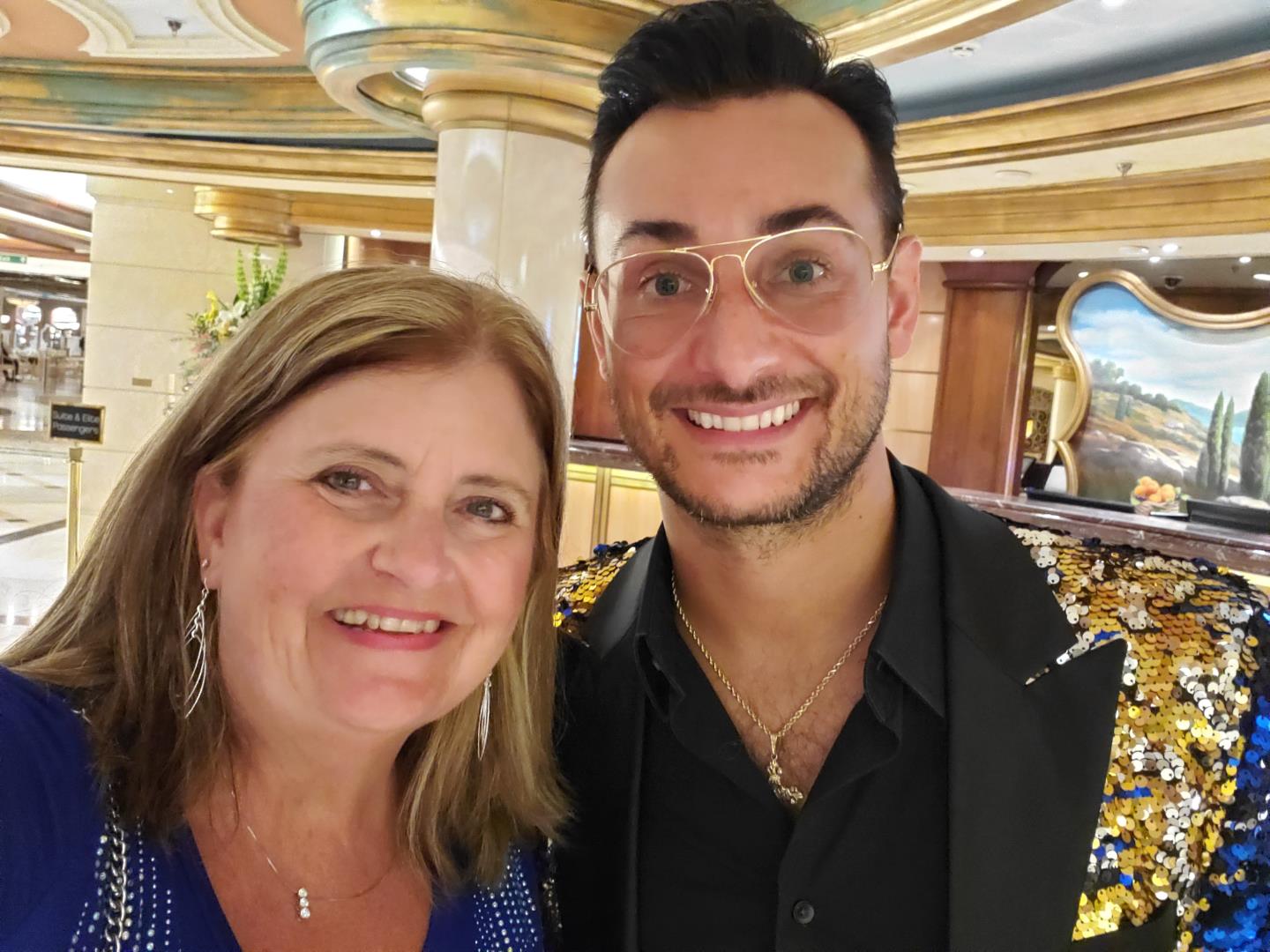 As for entertainment during the week, we enjoyed the live music & some of the shows.  Mr. Lou Gazzara of American Idol fame was the headliner one night.  He put on a really great show & then later in the week, I was fortunate to run into him walking around the ship & he was gracious enough to take a "selfie" with me!  We always found ourselves in the disco at night and danced to the DJ music.   We had a great DJ, in fact the first time that we've had a female DJ, "DJ Whit" from Ohio!  She had no problem playing all of our requests and she even got out on the dance floor to try and learn some line dances.  She'd always give us "last call" with about 3 songs left to request and often she'd play "just one more" for us.  She really made coming to the disco at night a lot of fun for us.  It was also a lot of fun for Bill & myself because we had other line dancers with us!   Often times on a cruise our "line" is two people long- just us!