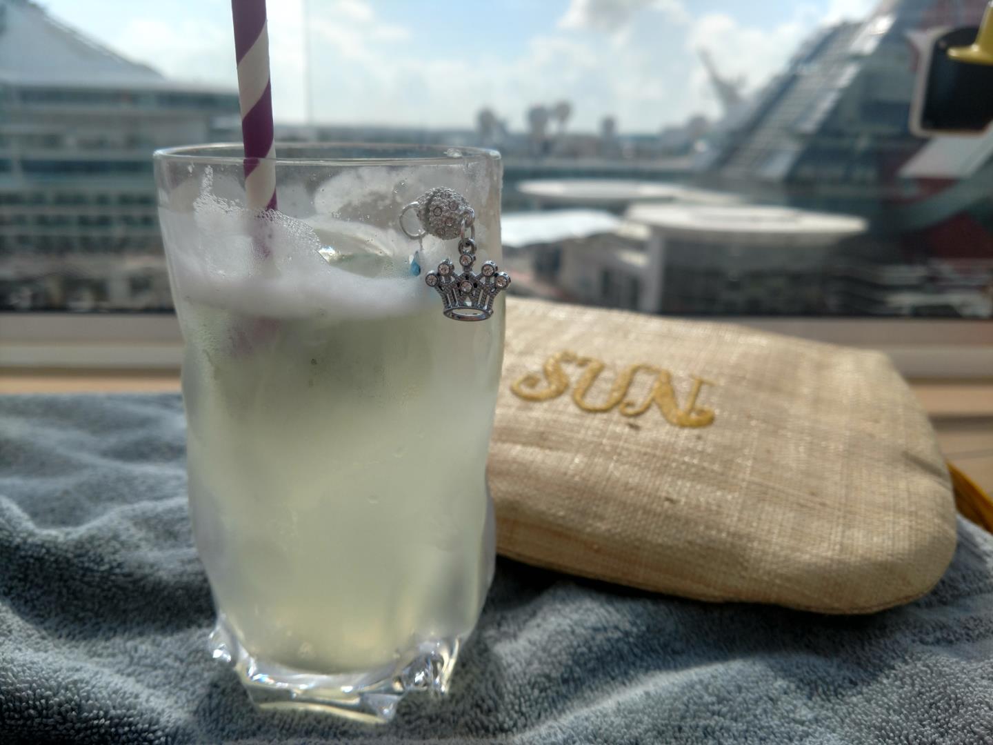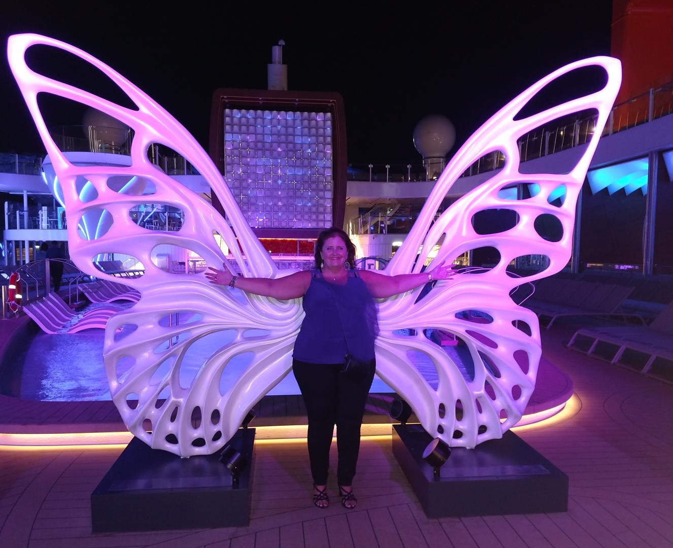 We were given color coded pins based on where our cabins were located and according to those pins, would determine which public space we'd be gathing in to view the Naming Ceremony that was taking place inside of the Theatre & outside by the Bow of the ship with the large bottle of champagne! The National Anthem was sung by the very talented Ashlie Amber Harris. We've seen her perform earlier this year on Celebrity Equinox and she is amazing. Lucky for you, I took a video of her performance!