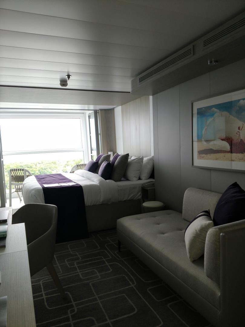The new innovation on this ship is the Infinite Verandah! I was assigned one of these cabins and I loved it! You have the ability to open up bi-fold doors so that the verandah becomes part of your cabin. There is also a window that you can move half way up or down to have fresh air & essentially an open balcony. It will only go down half way so that it is then like your traditional balcony. In this picture, we have the bbi-fold doors open so that we can use the balcony as part of the cabin space. Where you see that line midway in the window, when the window is down, that is your rail. It's really a cool concept. We had very calm waters on our cruise, so we slept most nights with the window down a little bit so that we could hear the ocean.