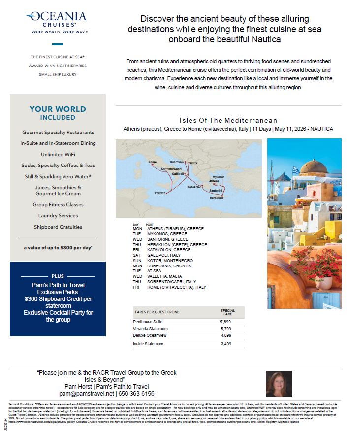 JOIN PAM & THE REGENCY AT CARAMELLA RANCH TRAVEL GROUP AS WE EMBARK ON AN 11 NIGHT JOURNEY FROM ATHENS TO ROME!!