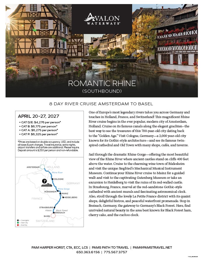 Please join Joelyne & Barbara Byers as they escort a group of family, friends and neighbors from Regency at Caramella Ranch sailing the Romantic Rhine River on Avalon Waterways!