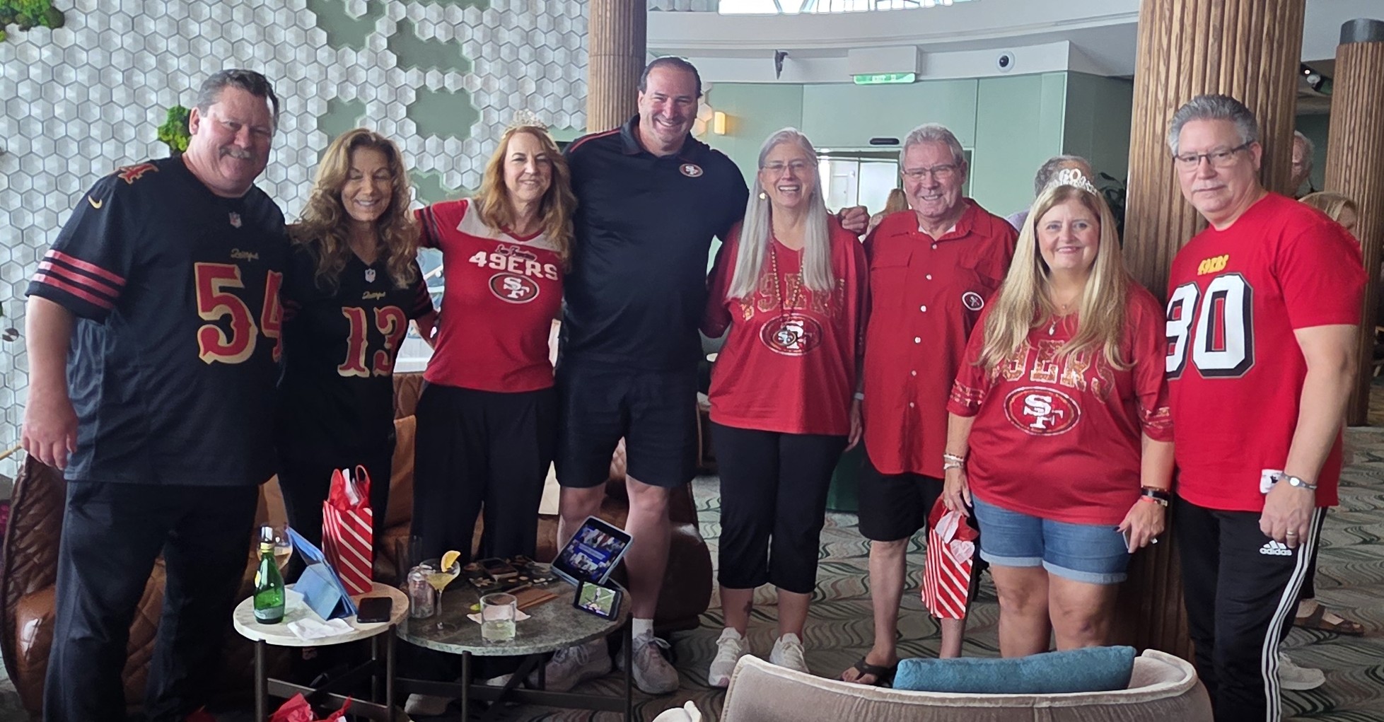 Several of our football friends had already boarded and scoped out a spot to sit and watch our 49er game together, so once we dropped off our luggage and I secured birthday decorations on everyone’s doors, we headed to Eden Lounge to join our friends to watch the game. We ended up bringing some lunch down to the lounge during halftime and enjoyed a 49er win together with our tailgate family who joined us for this cruise- one of whom was also celebrating her 60th birthday on the cruise.